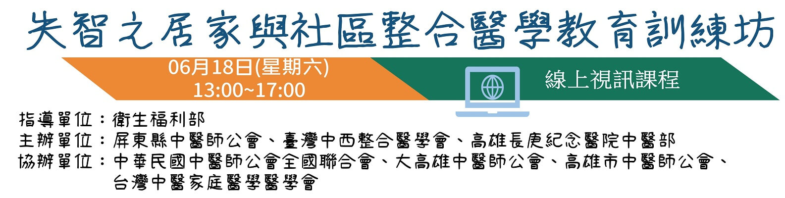 3 月232022 6/18【失智之居家與社區整合醫學教育訓練坊】 學術研討會2022-03-23時間:111年06月18日(星期六)13:00~17:00 ***線上視訊會議課程*** 主辦單位:屏東縣中醫… 閱讀內文