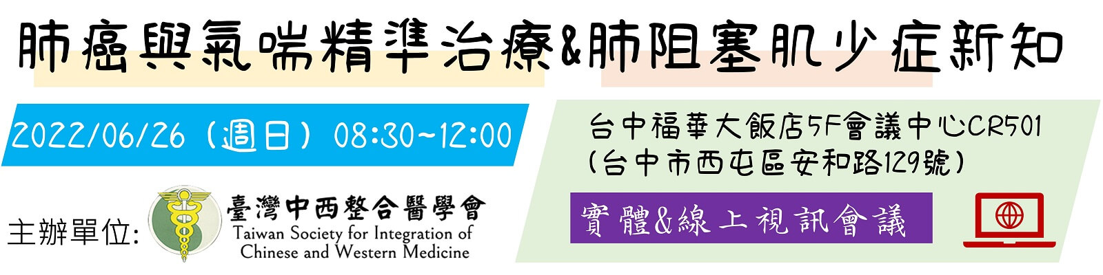 5 月272022 【肺癌與氣喘精準治療&肺阻塞肌少症新知】實體暨線上視訊課程 學術研討會2022-05-27時間: 2022 年 06 月 26 日 (星期日)08:30~12:00 地點:台中福華大飯店5F會議中心C… 閱讀內文