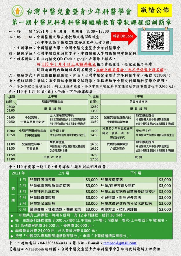 <轉知課程訊息>第一期中醫兒科專科醫師繼續教育帶狀課程 轉知訊息發佈者:中西整合醫學會 管理員2020-11-24台灣中醫兒童暨青少年科醫學會舉辦 <第一期中醫兒科專科醫師繼續教育帶狀課程> 時間:2021年1月…