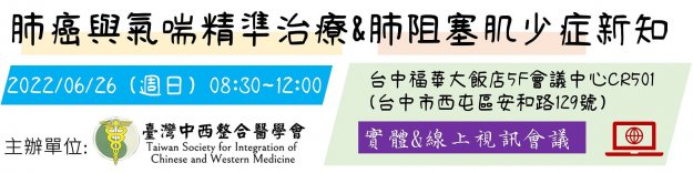 【肺癌與氣喘精準治療&肺阻塞肌少症新知】實體暨線上視訊課程 學術研討會發佈者:中西整合醫學會 管理員2022-05-27時間: 2022 年 06 月 26 日 (星期日)08:30~12:00 地點:台中福華大飯店5F會議中心C…
