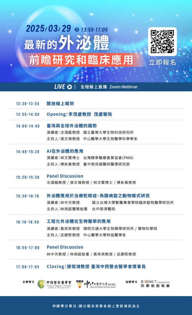 最新的外泌體前瞻研究和臨床應用 學術研討會發佈者:中西整合醫學會 管理員2025-03-12時間:3月29日(週六)13:55~17:05 ➤報名網址: https://www.surveycake.c…
