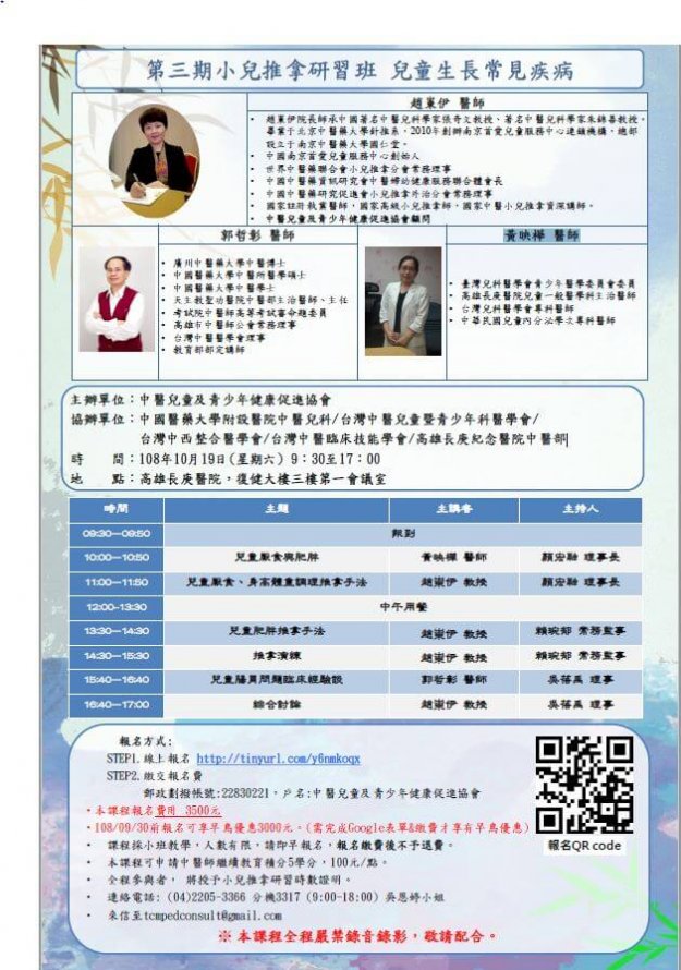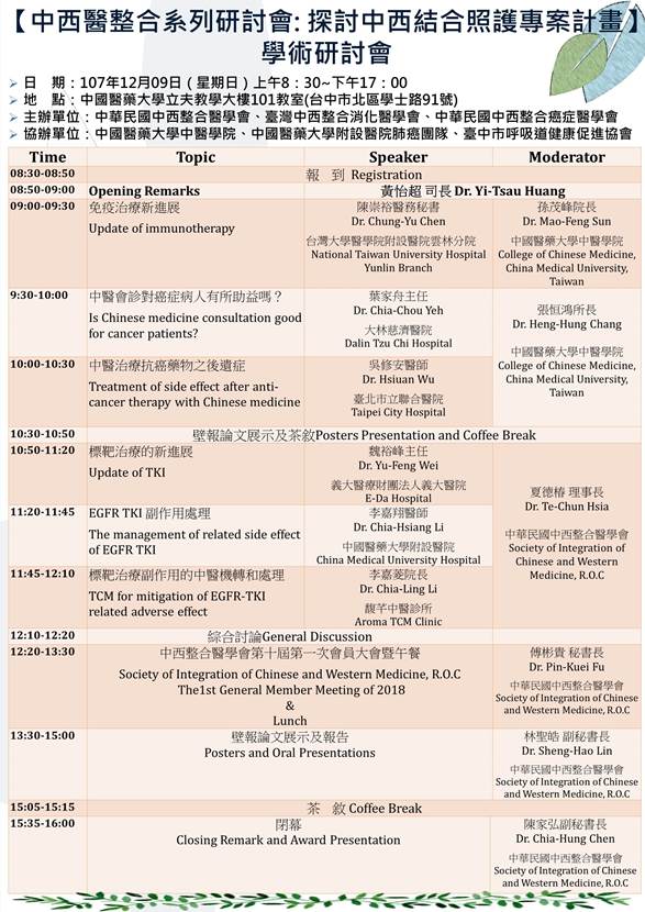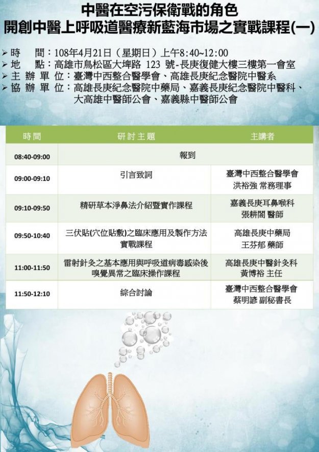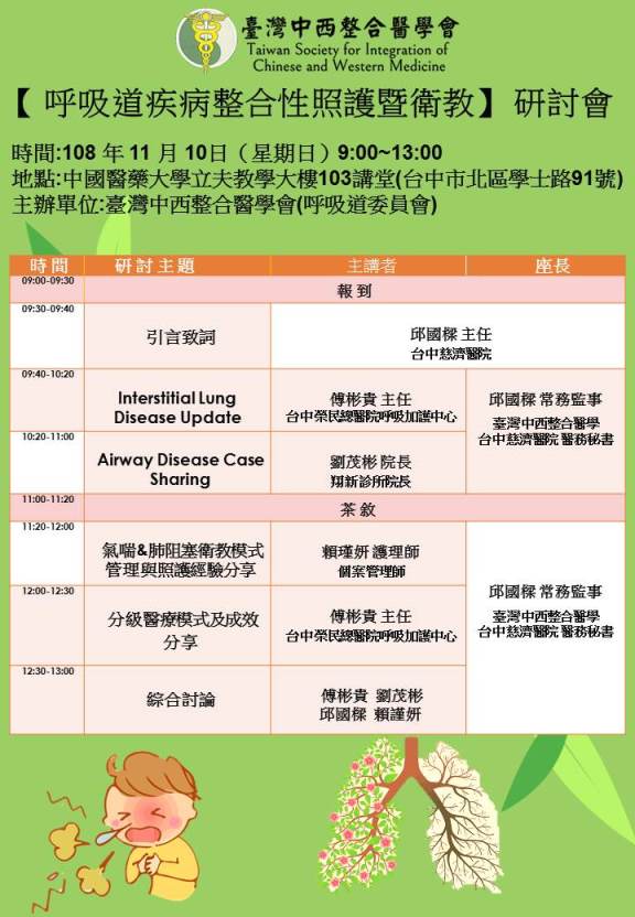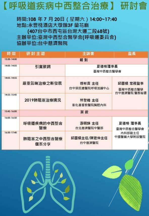主辦單位:臺灣中西整合醫學會(呼吸道委員會) 時間: 2019年11月10日(星期日) 9:00~13:00 …