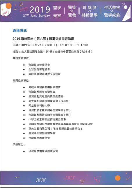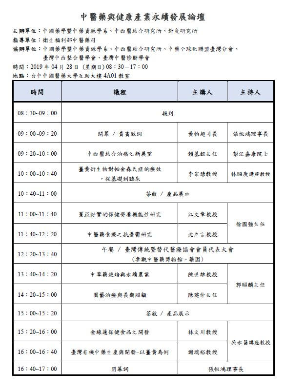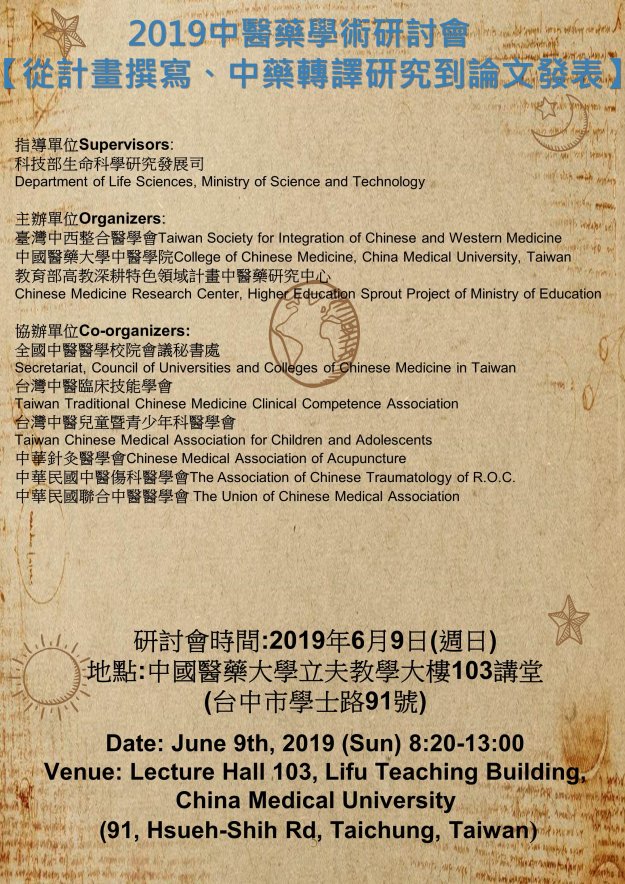 時間: 2019年6月9日(星期日)8:20a.m-13:00p.m 地點:中國醫藥大學立夫教學大樓103講堂…