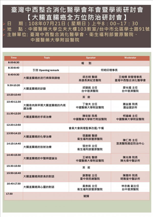 主題:大腸直腸癌全方位防治研討會 時間: 2019年7月21日(星期日)8:00a.m-17:0…