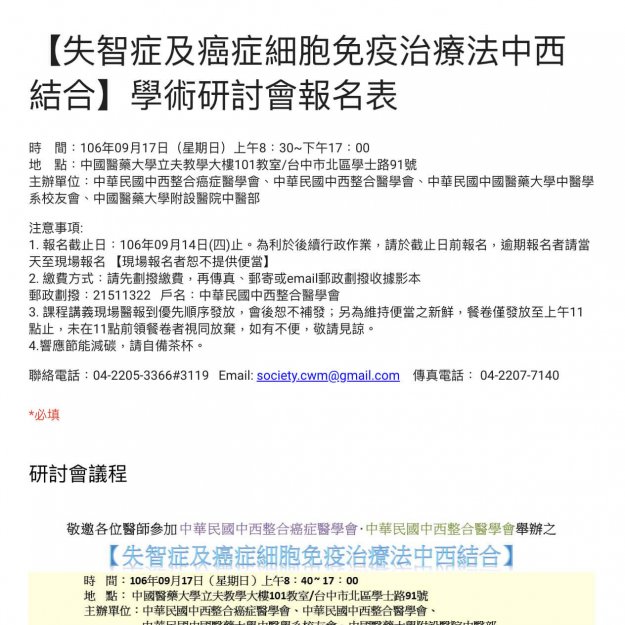 敬邀各位醫師參加【失智症及癌症細胞免疫治療法中西結合】學術研討會