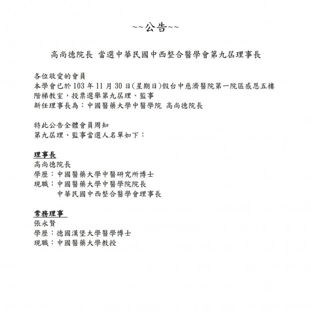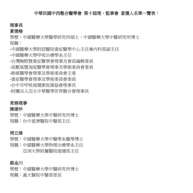 本學會已於 106 年 12 月 14 日(星期日)假中國醫藥大學立夫教學大樓五樓504教室,投票選舉第十屆理、監事並於 106 年 12 月 28 日(星期四)於第十屆第一次理監事會議中由理監事成員互選常務理監事、理事長及監事長。